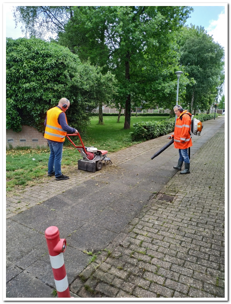 En daar kwam ik Willem en Martin tegen die de bestrating weer onkruidvrij borstelen en schoon blazen.