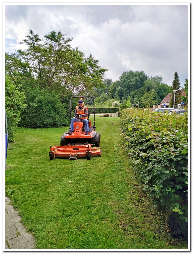 En hier is Rob lekker aan het maaien. Het groeit snel met veel zon en dan weer een felle bui regen.