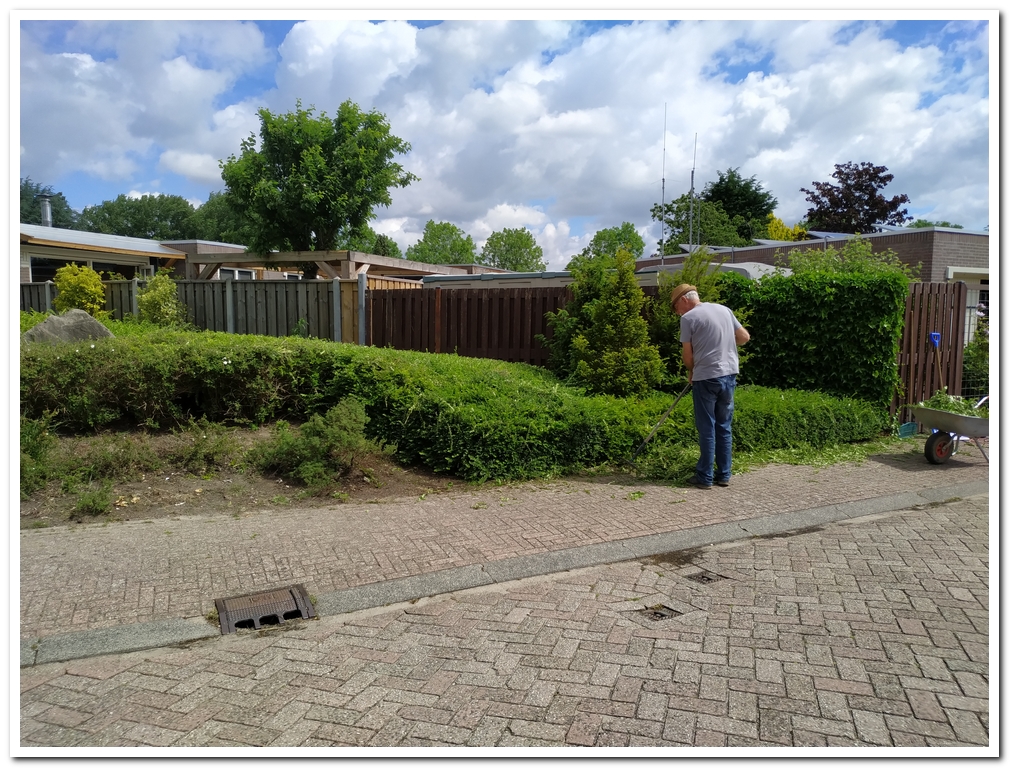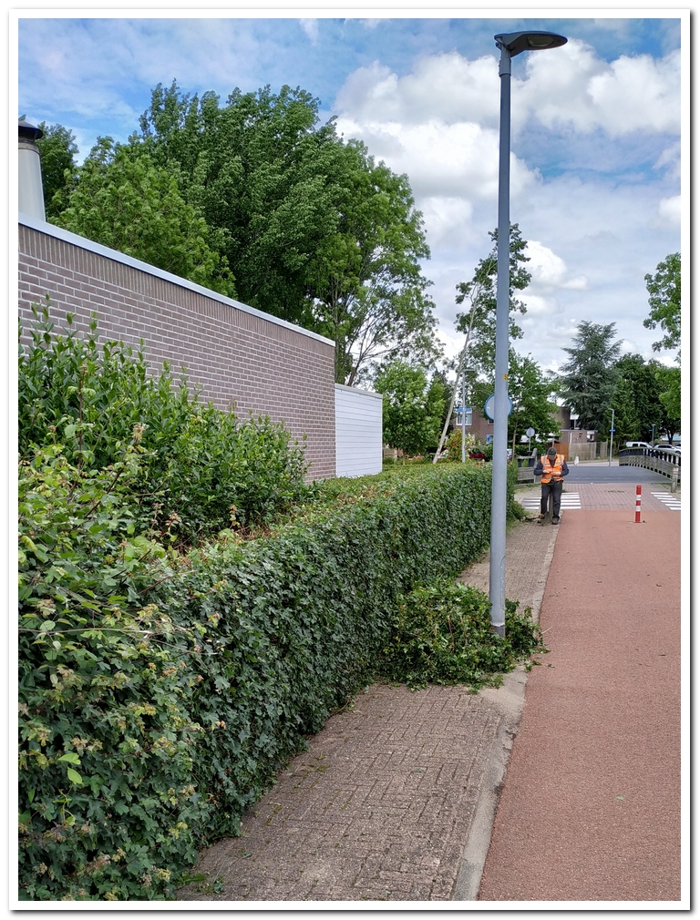 Martin en Hans hebben vast een aantal meters van beide heggen aan het fietspad bij de Kornbrug geschoren en gelijk een stuk lager gemaakt i.v.m. de verkeer veiligheid t.a.v. het zicht tussen auto’s en fietsen.