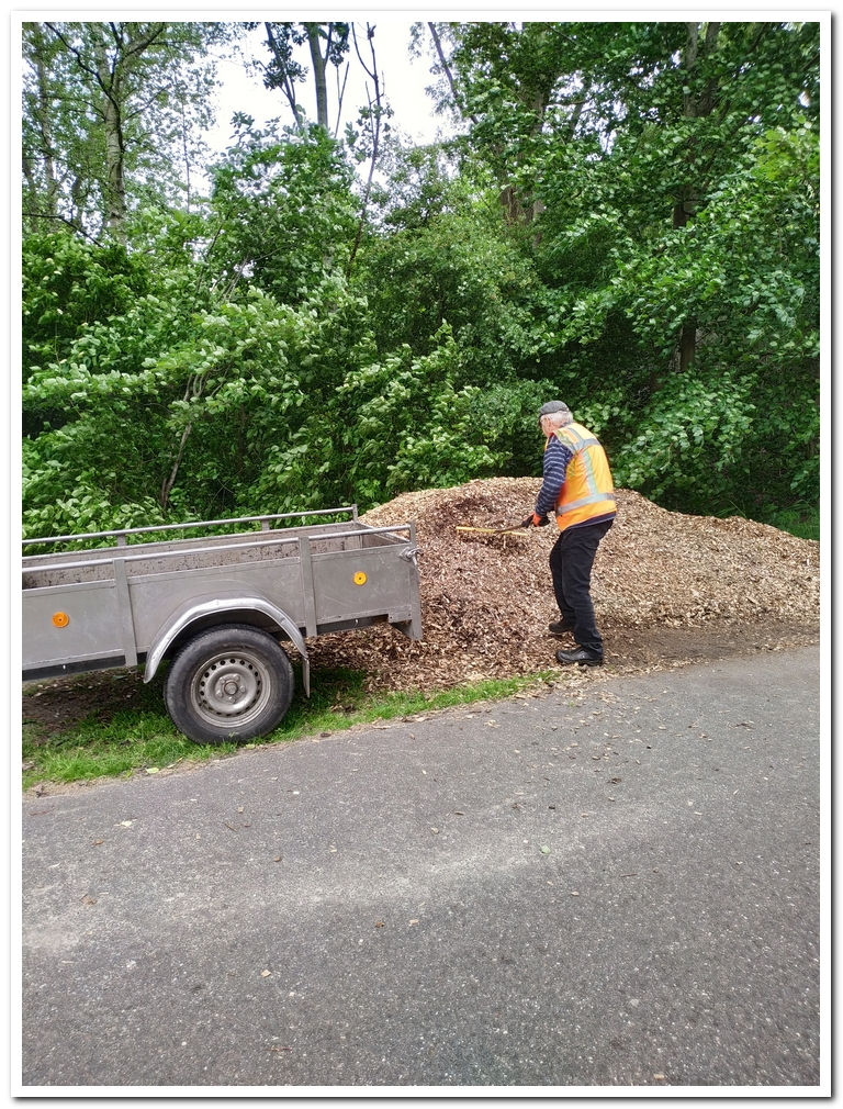 Na de heggen, met de tractor en aanhanger op diverse plaatsen rond het windbos hopen snippers gestort wat later door anderen met kruiwagens op bospaden wordt uitgereden.