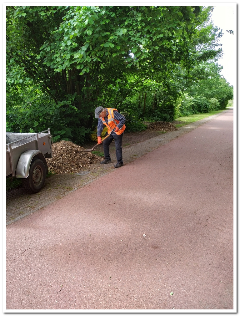 Thom en Elly hebben al het maaisel van de beplanting geharkt en alle paden aangeveegd. Onder de bankjes aan de steiger de tegels opnieuw netjes gelegd i.v.m. rattenholen. Daarnaast rond de afvalbak de beplanting mooi terug geknipt.
