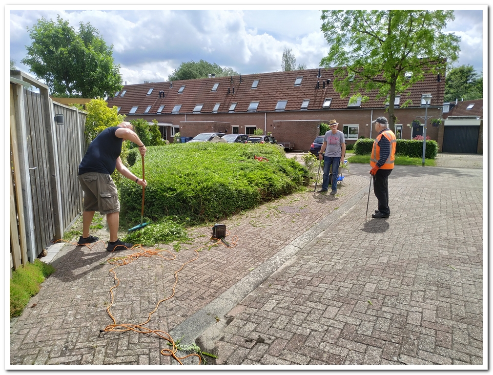 En hier rond “De Hoeksteen” zijn Wim en Peter al een tijdje bezig met onkruid verwijderen en scheren van de struiken. Ze willen later de begroeiing wat aanpassen, een deel struiken inperken, andere planten ingraven zodat ook straks de hoeksteen wat beter te zien is. Daarbij willen zij een lage afrastering om de bocht maken om te voorkomen dat de auto’s de bocht afsnijden en de planten vernielen.