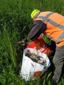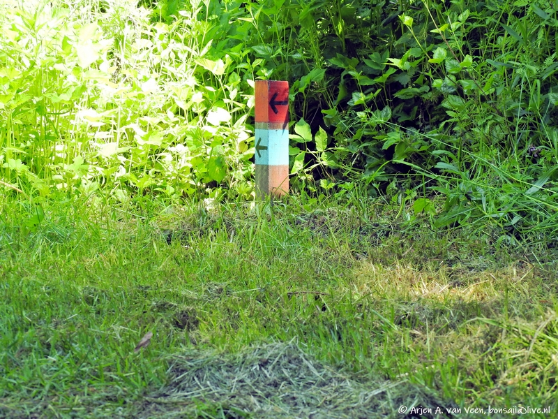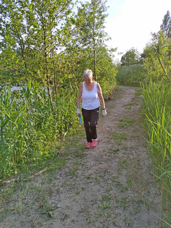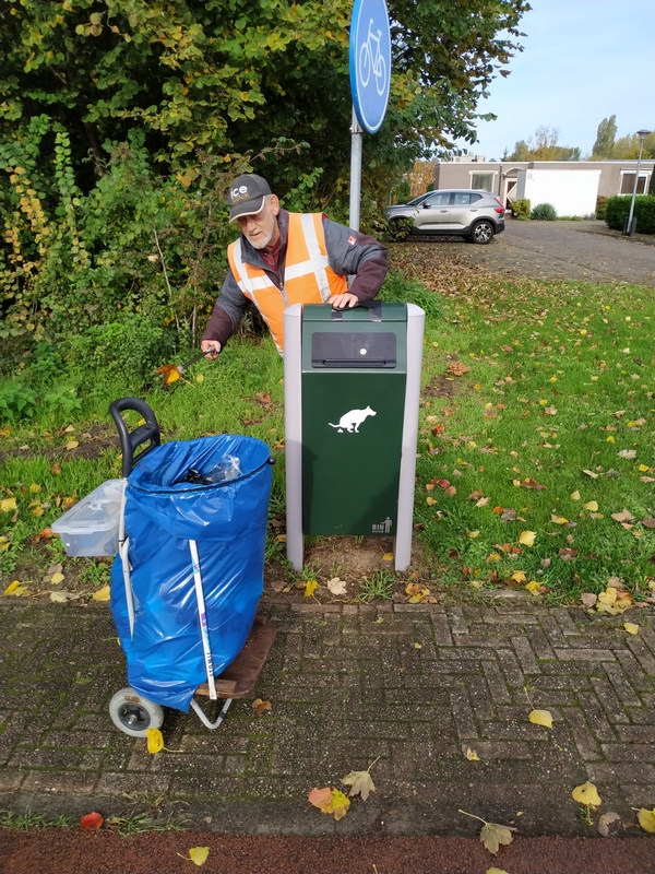 Alvorens Hans begon aan het legen van de afvalbakken heeft hij eerst twee wandelpaaltjes opnieuw geplaatst en diverse hoopjes groenafval opgeruimd.