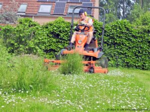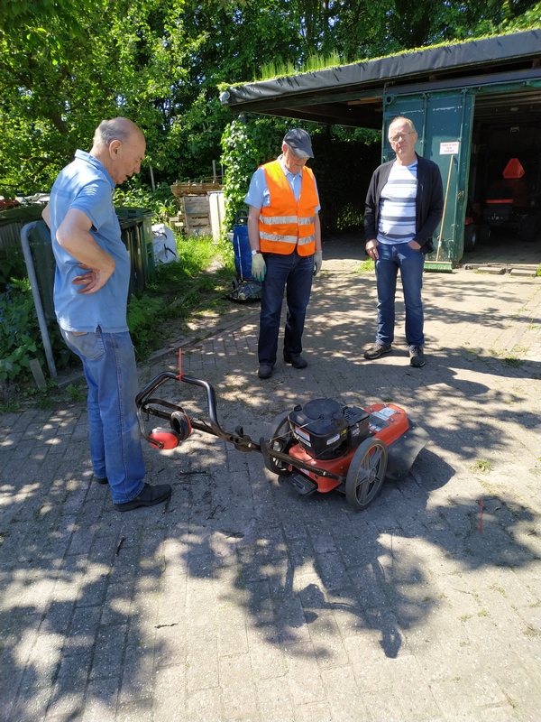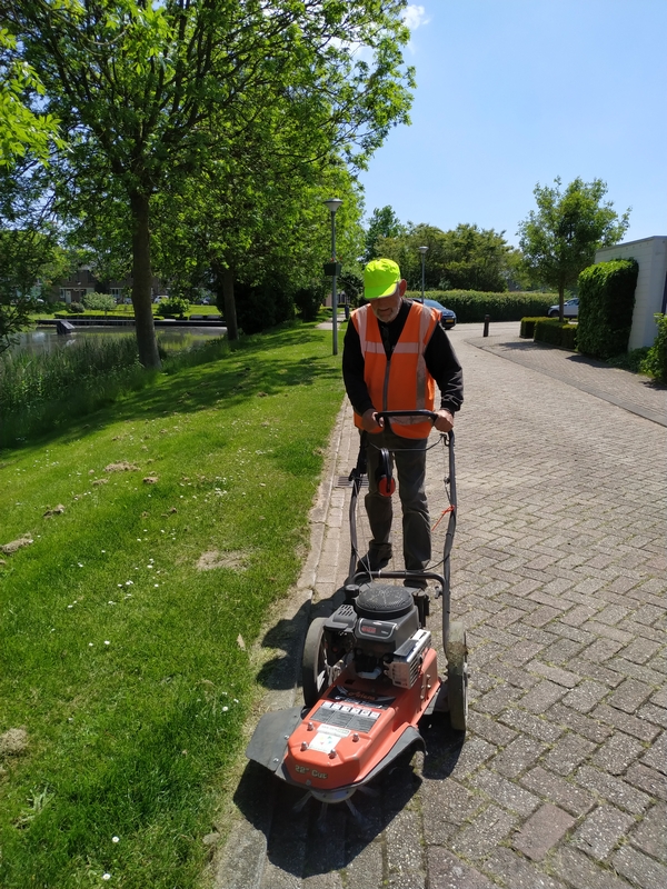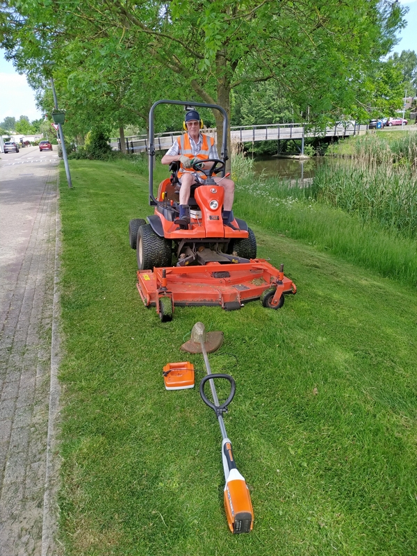 Nog geen week geleden gemaaid en nu is het weer nodig. Dit omdat het groeizaam weer is. Dan de maaibak een tikje lager instellen. Wat ziet het er nu mooi geschoren uit. En zo maaien Rob en Ad om beurten een deel in de wijk.