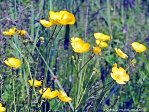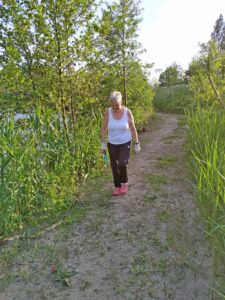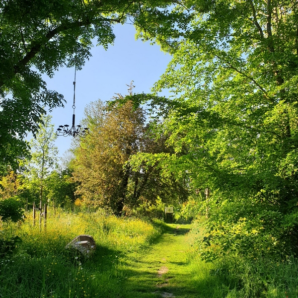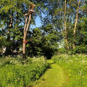 Het is niet ontgaan hoe mooi het wordt als het wandelpad net gemaaid is door het krachtbosje heen. Aan weerszijden de hoge begroeiing van boterbloemen, het boombankje gezaagd uit een populier onder de roestige kroonluchter. Dit pad loopt vanaf het fietspad naar het Tiny Forest. Even verder op de High Tea boom met tafel en stoel en daaronder weer het mooi gemaaide paadje met aan weerskanten het fluitenkruid. Trots keek Carol en genoot daarvan en bedankt hier de maaiploeg voor.
