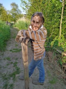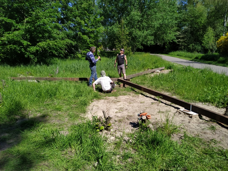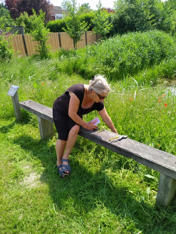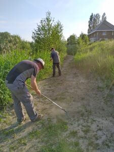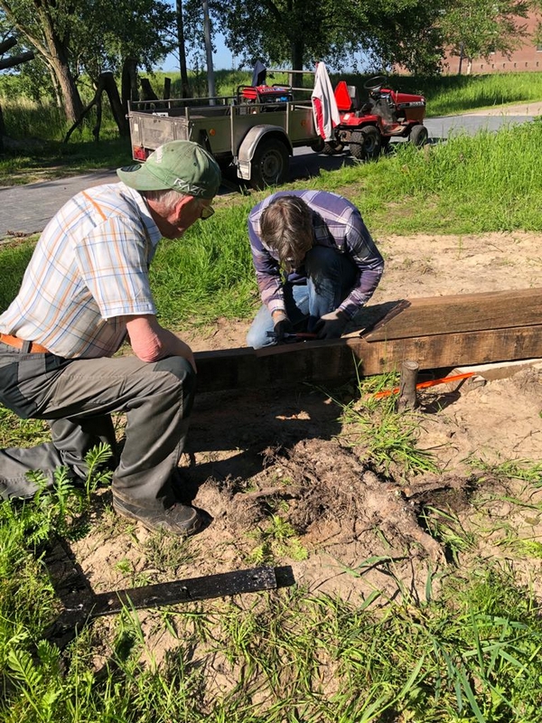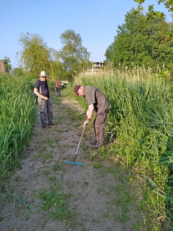 Na deze uitleg zijn Corinne en Yvonne begonnen om de heg langs het fietspad te schoffelen. Johan en Menno zijn weer doorgegaan met gras zaaien en in harken op het natuurpad. Tegelijker tijd hebben Ruud en Mike een bankje verder afgemaakt en Jos maakt hiervoor een mooie zichtlijn over de gracht door het riet weg te maaien.
