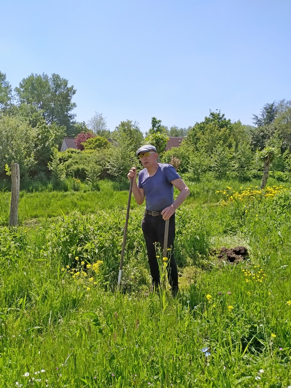 Joop bijt de spits af voor de nieuwe week. Hij schoffelt tussen de bloemen op het dijkje langs de kwelbeek.
