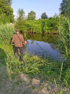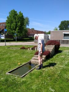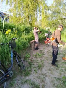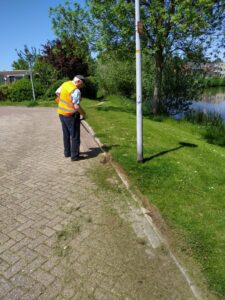 We hebben de straat langs de gracht geborsteld en gebosmaaid nadat Willem en Bram deze gerepareerd hebben. Daarna nog een deel van een heg gesnoeid.