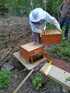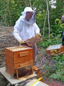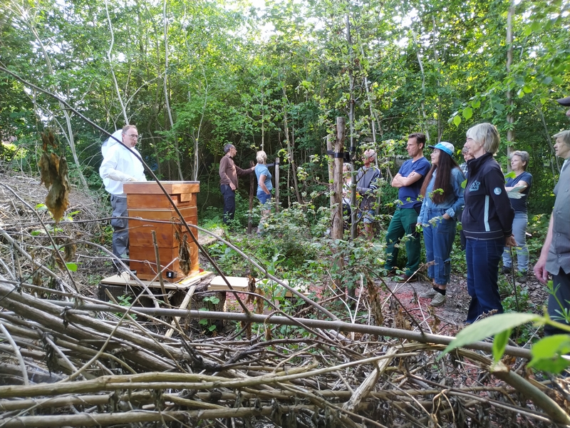 Op het kruispunt bij het grote veld hebben de braamsluipers zich verzameld om in het vogelbos eerst een educatieve uitleg te krijgen van Menno over het houden en verzorgen van een werkbijen volk, inclusief de koningin die de naam van Cindy mee kreeg. Menno heeft deze bijenkast trouwens zelf gemaakt.