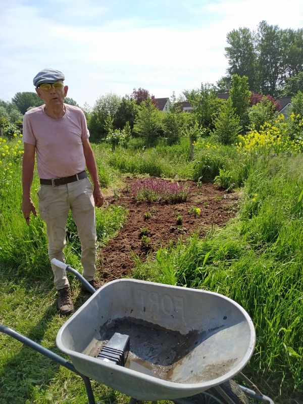 Joop is op diverse plekken op de dijk langs de kwelbeek bezig om nieuwe plantjes aan te brengen maar wel met bijen vriendelijke bloemen.