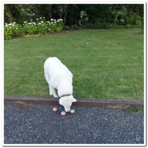 De hond van Rob weet nog niet met welke bal hij zal spelen. Ga dan maar op de reuk af zou ik zeggen.