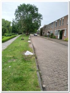Er is een overleg geweest met enkele bewoners aan deze straat en het wijkbeheer, om een oplossing te vinden dat met name de grote en lange vrachtwagens die het nodig vinden om een gedeelte op het gras te rijden op het moment als er privé geparkeerde auto’s voor de deur staan. Nu is overeen gekomen dat er tijdelijk deze witte betonnen blokken komen, die reeds zijn geplaatst. Daarnaast was er een voorstel om de straat te verbreden met één meter aan de graskant. Als de blokken geen positief effect hebben, zal de gemeente dit voorstel begin volgend jaar overwegen.