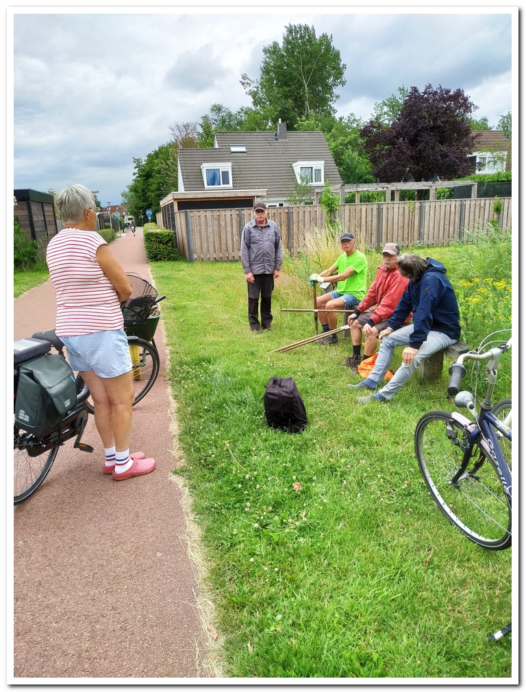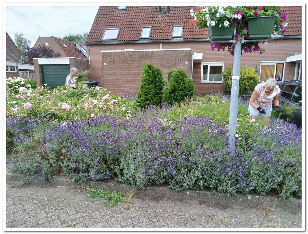 Hier zijn Anneke en Ine bezig om al het hoge gras tussen de planten te verwijderen in de border op de hoogte van HW.35.
