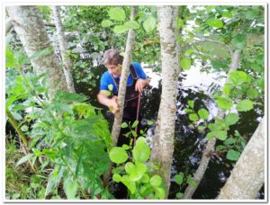 Ruud te water om de uitlaat van de kwelbeek duiker op te zoeken voor de zoveelste keer.