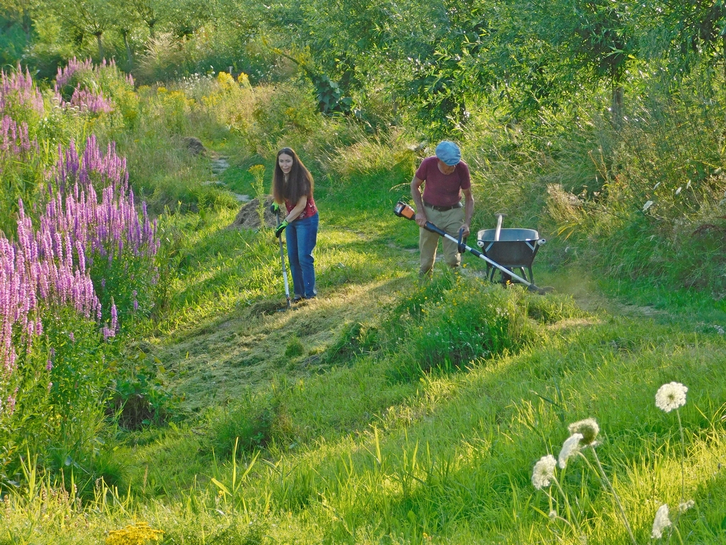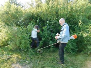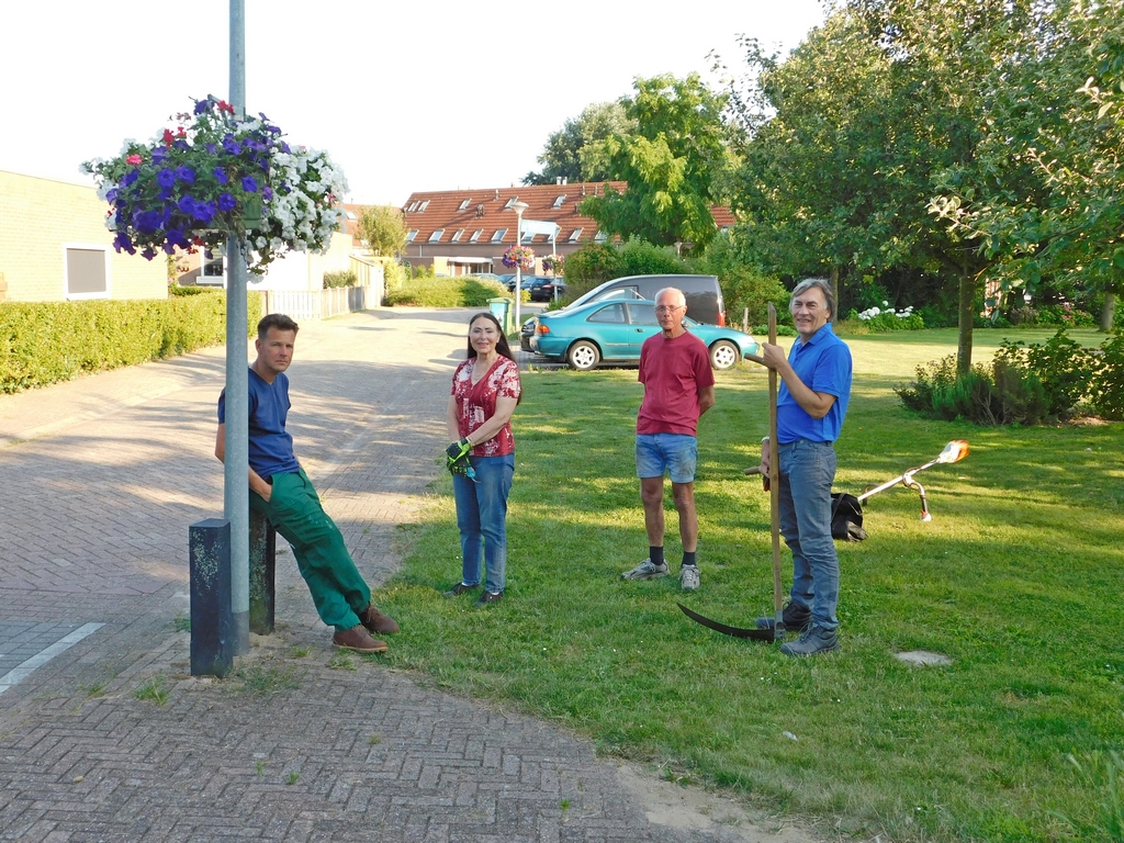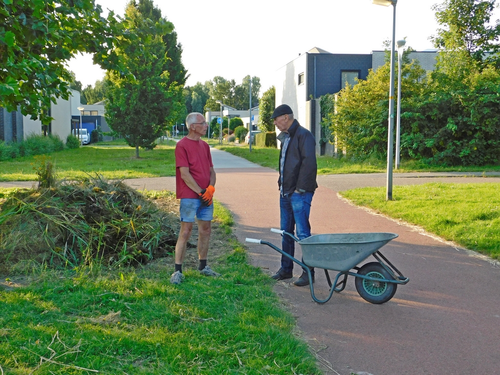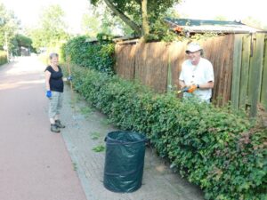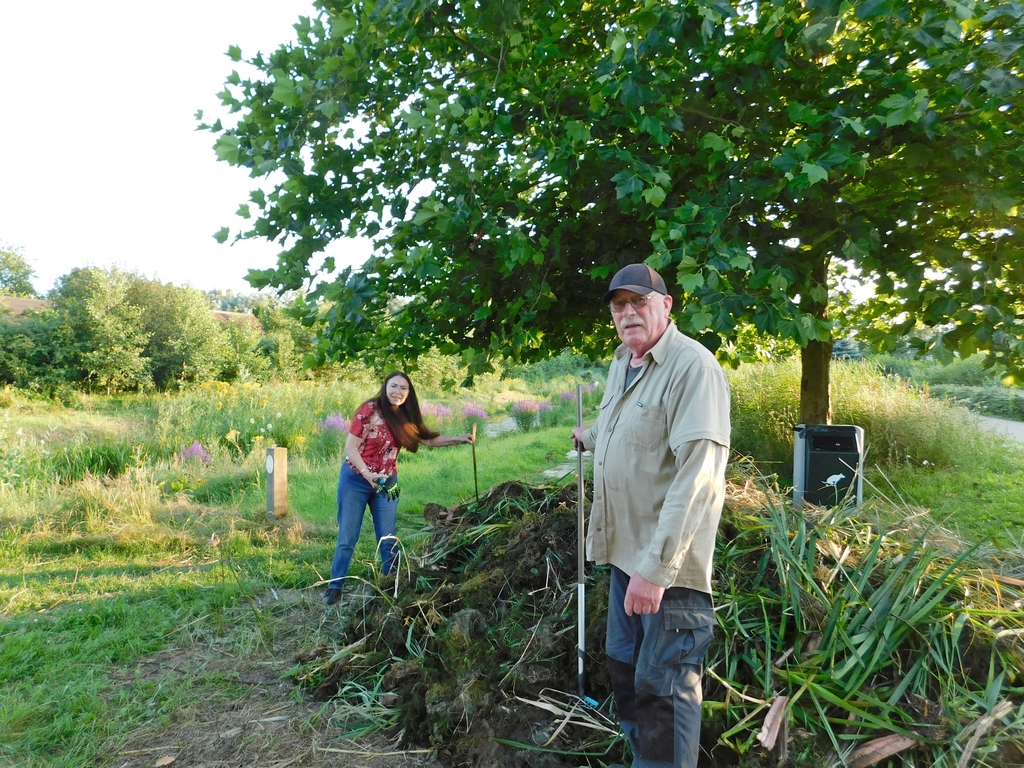Ondanks een aantal afmeldingen i.v.m. vakantie kwam er deze avond toch nog een flink aantal braamsluipers op het verzamelpunt bij elkaar. Daar had je Yvonne, Levien, Ad, Rudy, Regien , Ruud, Johan en Joop. Bart en Corine waren al druk bezig langs het fietspad aan de achterkant van hun huis om onder de heggen te schoffelen en te snoeien en mede het schoffelen van de boomgaard. De anderen verspreiden zich naar de door hun gekozen werkzaamheden. Rudy ging met de bosmaaier bij “de plek” aan het werk en Regien ging hem helpen. Ruud was daar in de buurt ook bezig, maar dan als man met de zeis. De anderen gingen Joop ondersteuning geven met het afvoeren van wat hij de afgelopen dagen uit de kwelbeek had getrokken aan riet en ander groen spul. Daar was hij ook vanavond nog mee bezig, maar dat verse spul moest eerst nog even aan de kant liggen drogen voordat het afgevoerd kon worden. Dat neemt niet weg dat de vele kleine hoopjes langs de kwelbeek wederom een flinke nieuwe hoop van Joop opleverde. En dat 1 dag nadat de vorige hoop door de gemeente was weggehaald.
