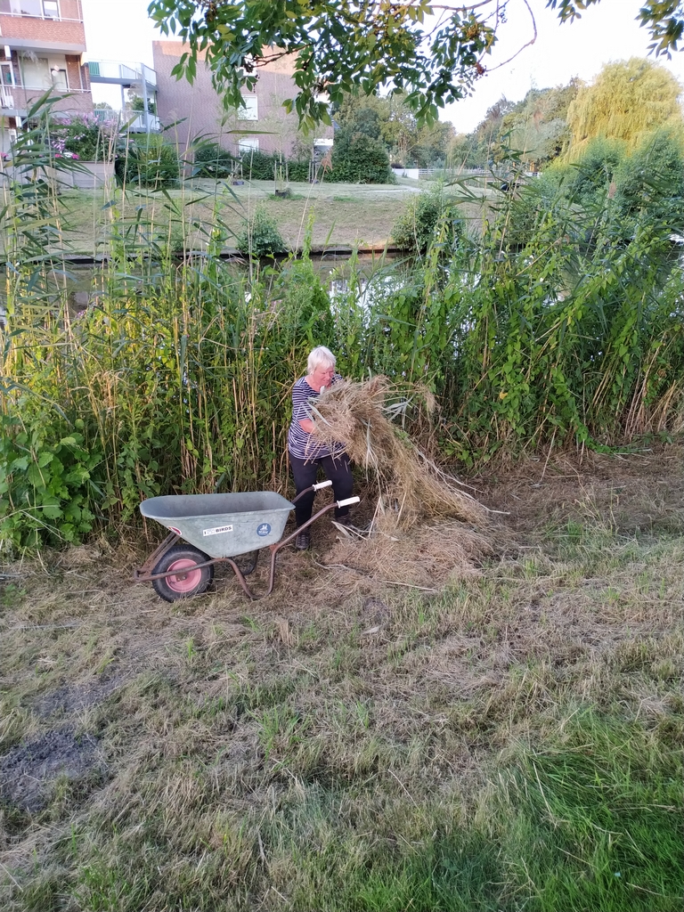 Greet en Hester hebben een begin gemaakt met het afvoeren van een deel van de 35 hopen gras op het talud langs de gracht en dat met de kruiwagen. Dat is een eind lopen voordat je bij de hoop van Joop bent.