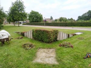 En vanaf de brug tot de bocht van de gracht heeft Hans de hopen gras in de 4 gele zakken gedaan om later afgevoerd te worden met de tractor of met de kruiwagen.