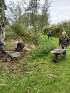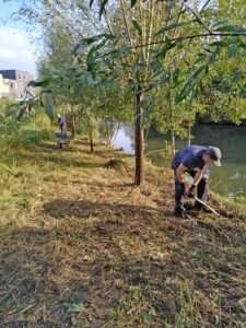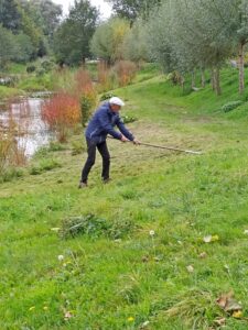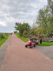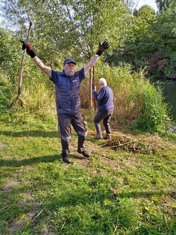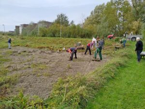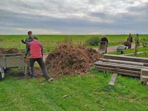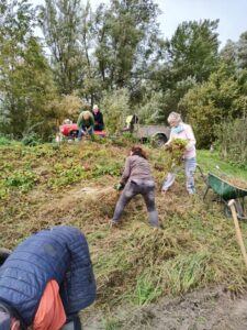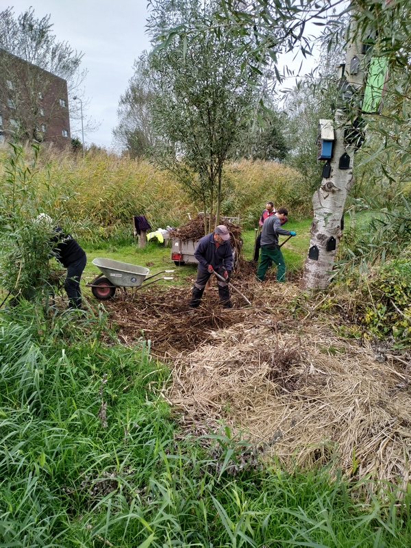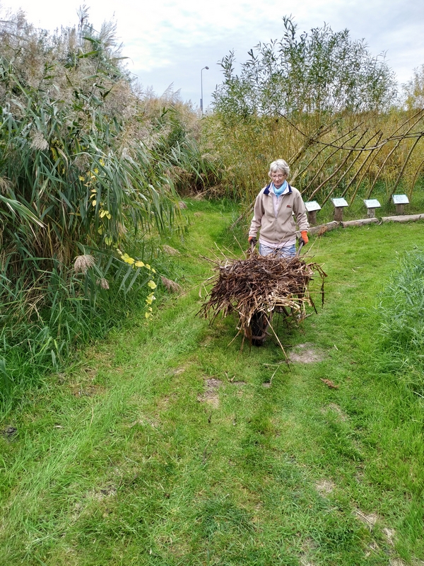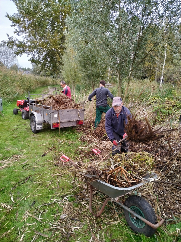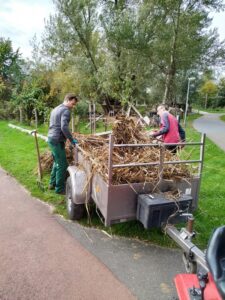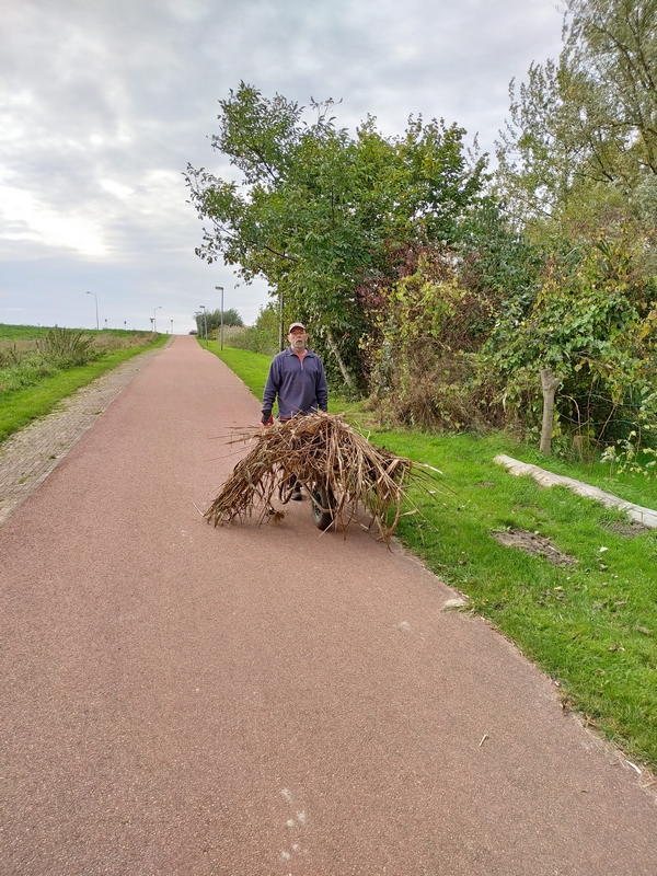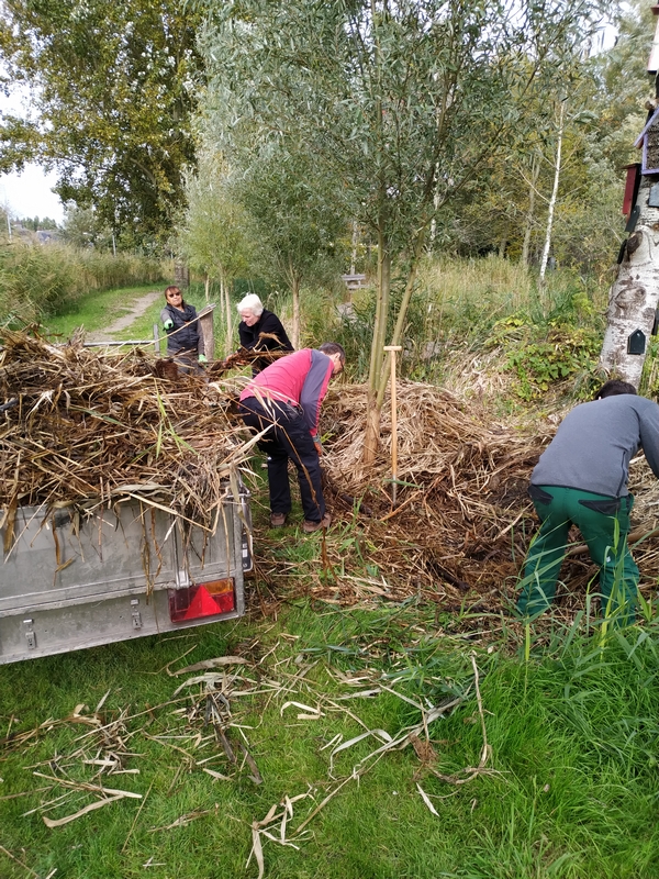En het mag wel gezegd worden: de groepsapp (meldt er een activiteit aan die je wilt ondernemen en kijk wie er mee wil doen) die Greet gemaakt heeft werkt uitstekend. Om het riet bij het ooievaarsnest te verplaatsen naar een ophaalpunt door de gemeente, hebben op deze manier negen vrijwilligers zich gemeld om te helpen. Bijna allen doken direct op de riet hoop om dit af te voeren met kruiwagens en met de aanhanger. Binnen een uur al was al het riet verplaatst door: Greet, Hester, Mike, Levien, Hans, Jos en Marlies. Het was wel zwaar want het riet met wortel, lag er al een lange tijd en was ingezakt en nat, dus moeilijk los te harken.