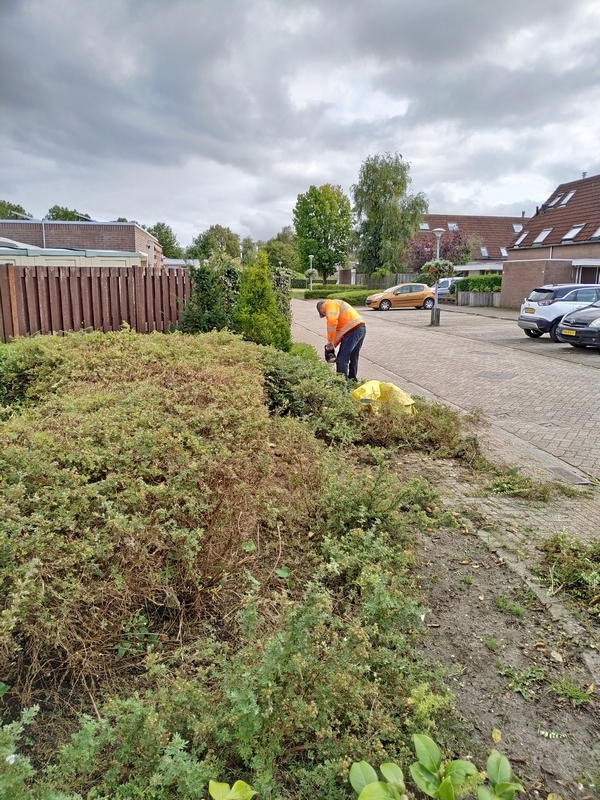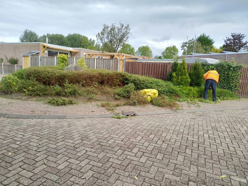 Martin en Hans hebben de beplanting van de Hoeksteen flink terug gesnoeid klaar voor de winter en het groen gelijk afgevoerd.