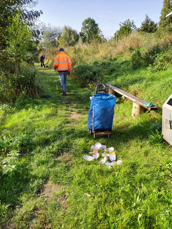 ![]() Martin en Hans doen de afvalbakken ronde. De bakken waren voller dan anders, zeker deze langs het natuurpad. Ook wat zwerfvuil. |