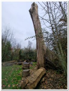 Hier is een Grote Bonte Specht even flink te keer gegaan op de oude stomp van een populier in het Krachtbossie. Was dit een oefengat of gaat deze in het voorjaar bezet worden? In een vorige uitgehakte hol in diezelfde populier zat in het voorjaar lekker een paar spreeuwen te broeden. Eens kijken hoe het in 2025 gaat uitpakken!