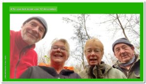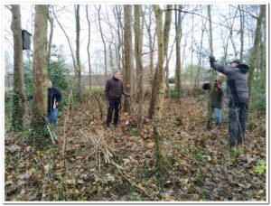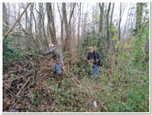 De nacht is koud, de ochtend dampend kil. We trekken dikke kleren aan en twee van ons trekken een muts over hun gladde bol. Diana stelt voor om de laatste horde richting het Hoekwierde(fiets)pad te nemen. Vanaf het pad ziet het er al overweldigend uit, maar vanuit het bos oogt het nog ondoordringbaarderder. Daar hebben we dus reuze zin in! Twee werken vanaf het fietspad het bos in, drie vanuit het bos. We zien elkaar niet. Maar na een krap uurtje wijkt het struikgewas en zien steeds meer van elkaar. Clematis en braam zijn hier in de struiken en in de kronen van de bomen zo met elkaar verstrengeld dat we het er soms niet uitgetrokken krijgen. Zo hoog mogelijk afknippen met de telescoopschaar is wat ons rest. We graven ook weer heel wat wortels uit, maar het zijn er teveel om ze allemaal te verwijderen. Er komt veel snoei vanaf, we verdubbelen zo’n beetje de hoogte van de bestaande ril, maar laten op aanwijzen van Greet een mooie doorgang voor de reeën vrij. Een bijzonder geslaagde ochtend, veel gedaan, maar toch niet helemaal afgekregen.