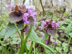 Overal de kleuren van het voorjaar. Paarse dovenetel en de rode sierbes. De kikkers huppen rond op zoek naar een partner.