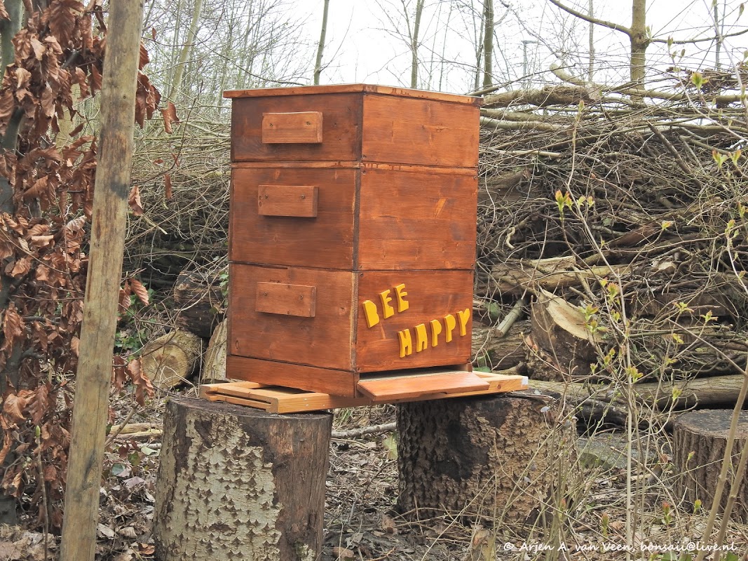Menno plaatst een bijenkast in een rustig hoekje van het vogel bos. Het volkje zal later arriveren. Bee Happy.