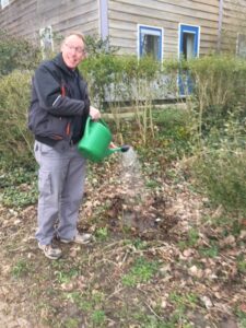 Nicolette geeft de nieuwe plantjes in de vlinderstrook en de nieuwe boompjes in het bos water.