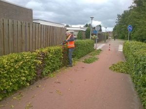 Rudy bosmaait het laatste stuk talud bij de Hoekbrug en maait het onkruid weg in de bestrating rond de afval containers.