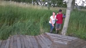 “Hoera”, na een half jaar is het zover. De laatste plank van het plankier wordt gemonteerd door het trio Regien, Rob en Mike .