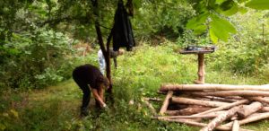 Greet; “Vandaag hebben Johan, Marlies en ik al het oude hout van de hut weg gerild en bramen gestoken en gesnoeid. Ook hebben we een koffiehoek gemaakt voor de toekomstige huttenbouwers.