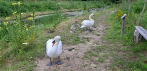 De Knobbelzwanen waren weer met hun jongen (dit jaar 2 donkere exemplaren) in de kwelsloot aanwezig. “