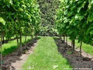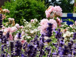 Hans K. schoont de rozenpiramides. Op het grote veld is het genieten van de borders.