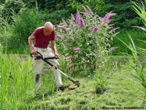 Lap leegt alle afvalbakken. Hij gaat vervolgens op de knieën voor het schonen van het nieuwe perkje bij de Kornbrug en achter Maryse. Tot slot maait hij alle bankjes en fotopaaltjes langs de beek vrij. Joop bosmaait en hoopt.