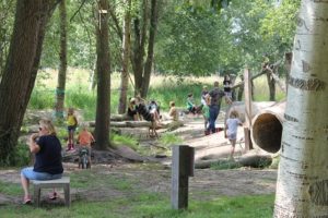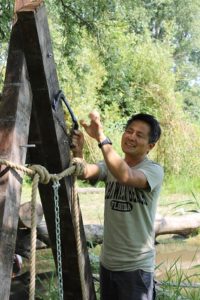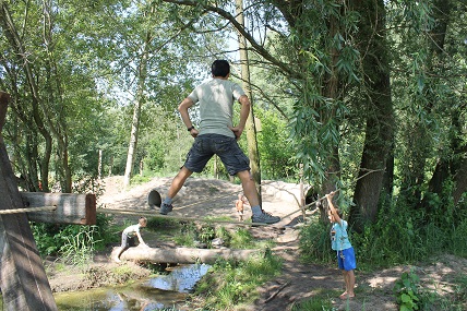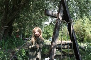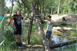 In de middag gaan zoon Mark en ik werken aan een nieuw voorziening op de plek. Wij halen een touw weg en bouwen een staander voor een wiebelbrug. Een ontwerp van Evi. Woensdag gaan wij verder.