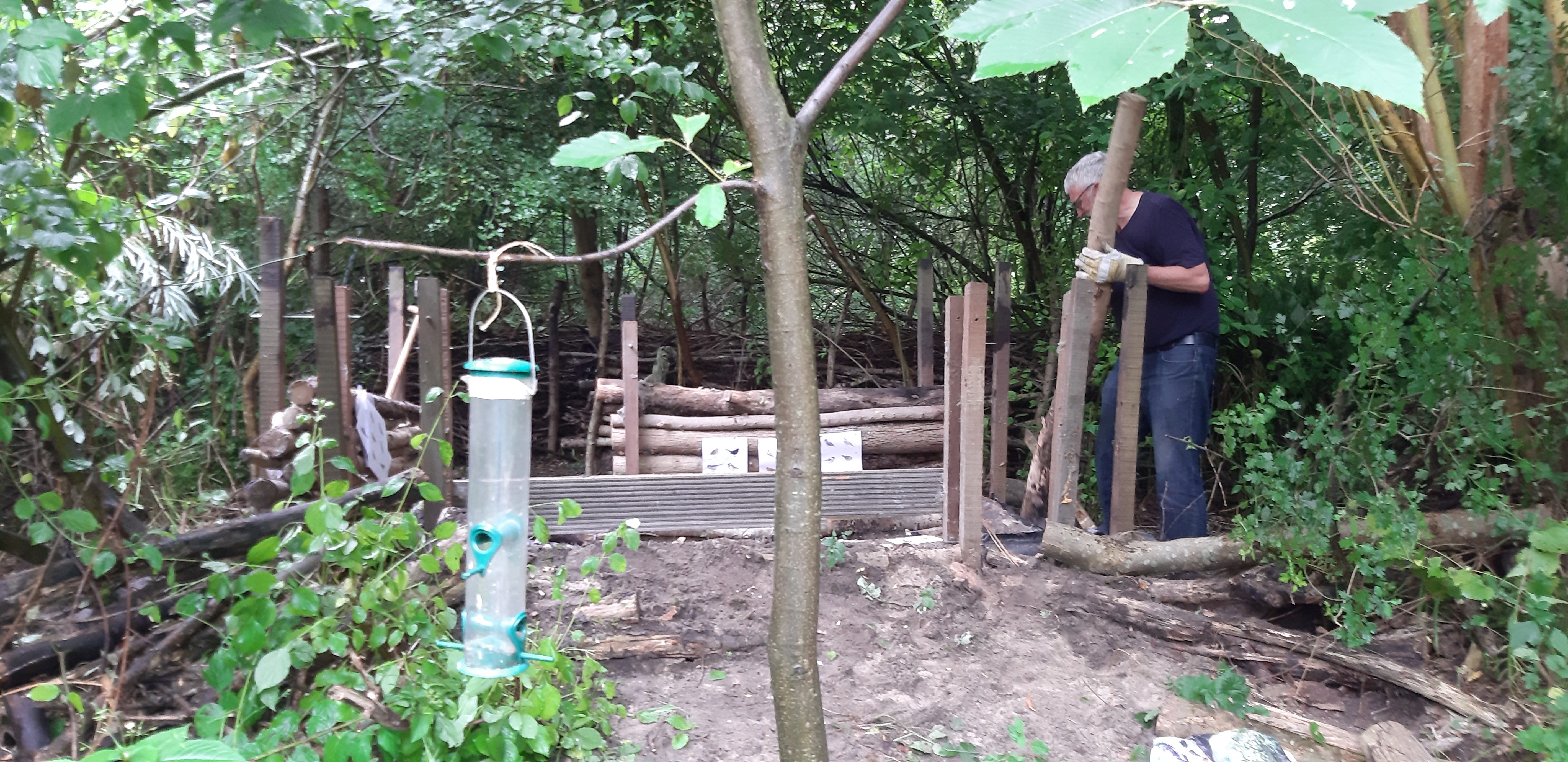 Mike en Greet gaan in het windbos onthutten. Greet; “Mike heeft bijna alle palen die er nog stonden uitgegraven en ik heb een nieuwe ril gemaakt van het oude hout ter bescherming van de vos. Ook een mooi overwoekerd taxusboompje in het bos is uitgegraven en voor de Goudhaantjes voor de hut ingegraven”