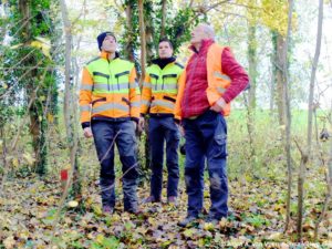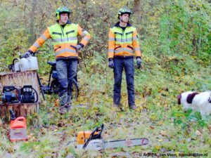 Lap controleert samen met Henk Winter de bomen in het vogelbos. Er blijken geen gevaarlijke bomen te zijn die gezaagd moeten worden.
