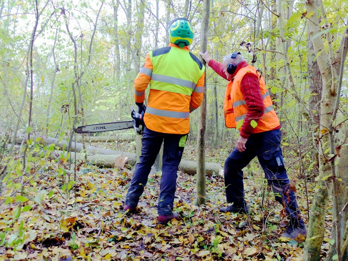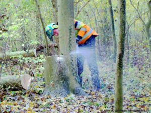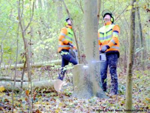 Wij kiezen ervoor om een heel vak te vellen. Als je dat niet doet dan heb je jaarlijks het risico dat de jonge aanplant een klap krijgt. De mannen zagen 2 uur. En nemen zodoende twee vakken voor hun rekening. Als de zaagploeg arriveert
