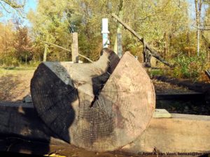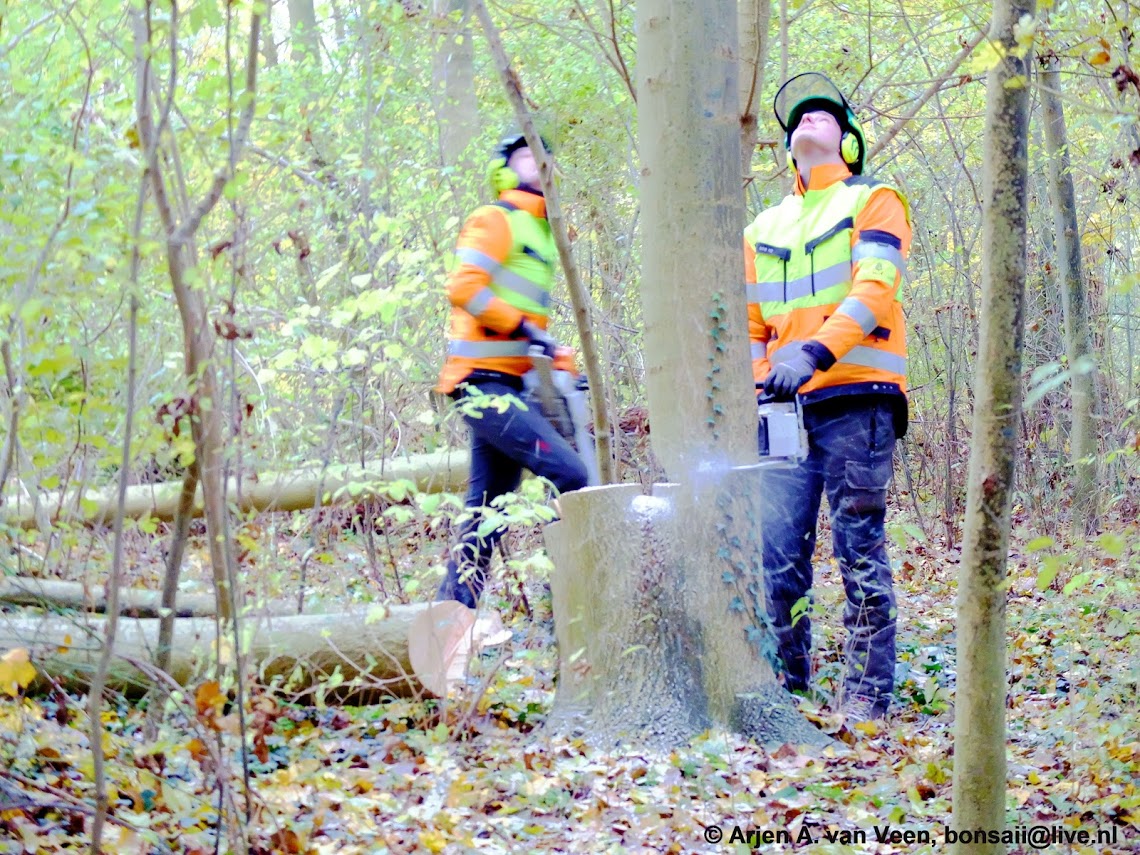 Om half 9 starten de twee zaagkanjers van Piet de Vries, Ferry en Tjerk, bomen van kerels, met het vellen van zieke essen.