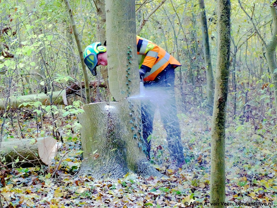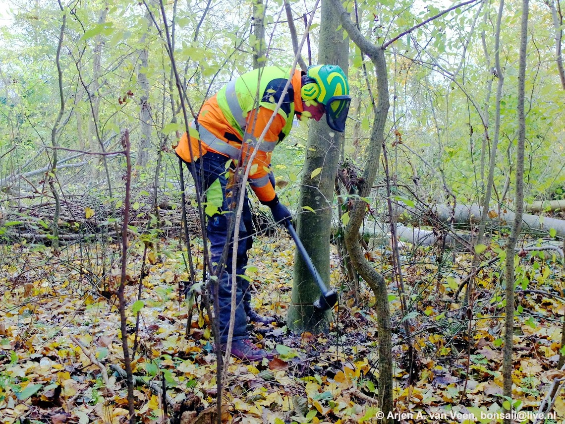 De anti processie bollen gaan voor een deel de grond in. Greet, Hester, CC en ik tekenen hiervoor. Leuk werk met een nog leuker vooruitzicht om in het voorjaar bij alle eiken een gekleurde boomspiegel te gaan zien. En als het werkt is het een dubbel feest. En Rudy, Rudy zaagt door en door. Hij heeft geen oog voor het laatste kleurtje van CC.