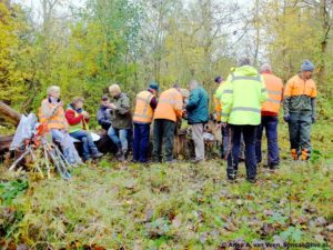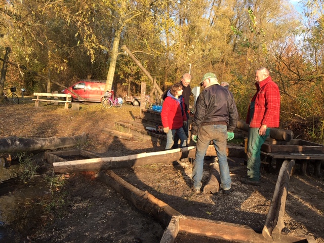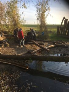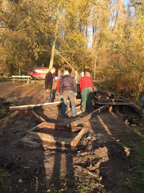 Ieder op eigen tempo want wij “oudjes” hebben allemaal wel wat. De een wat meer dan de ander. Maar dat levert ook solidariteit, wij zijn lekker buiten en vermaken ons opperbest. En met z’n allen verzet je toch weer een hoop werk. Al snel kan het logistieke trio Hans, Lap en Regien gaan pendelen met goed gevulde karren. In de pauze nemen wij afscheid van Ferry en Tjerk.