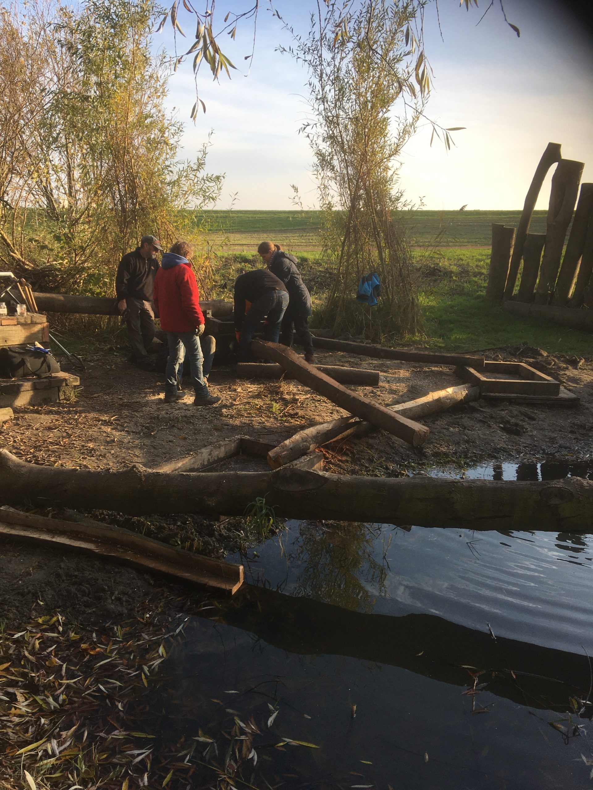 Wij maken de hoofdstructuur van het labyrint op orde. Alle goten hebben voldoende afschot. Dat was makkelijker gezegd dan gedaan.  Mike weet een manier om water van onder naar boven te laten stromen. Nu de afvoeren en pluggen in de bakken nog. Volgende week vrijdag gaan wij weer verder op de plek.