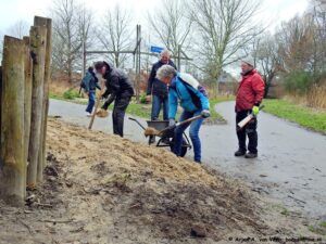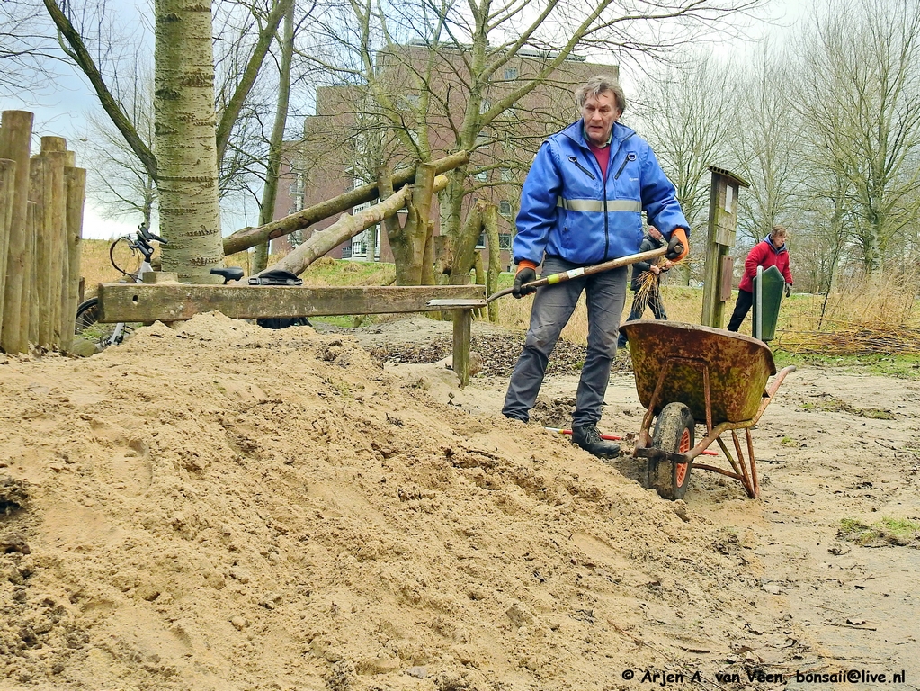 Te beginnen met extra zand brengen met kruiwagens voor onder de schommel. Daarna zand brengen naar het wandelpad in het Windbos, wat gedeeltelijk in het verleden glooiend is uitgediept, toch weer op te hogen met zand omdat het te vaak blank staat.
