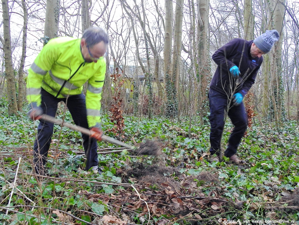 Hier zijn de boys druk bezig de diverse soorten nieuwe beplanting in te graven in het bos tegenover waar Levien woont.