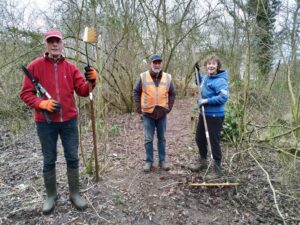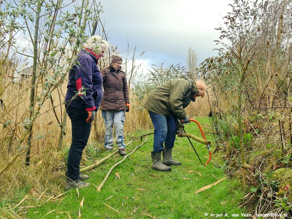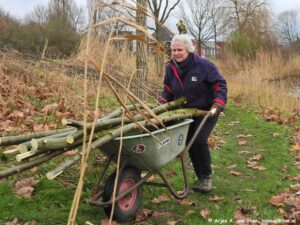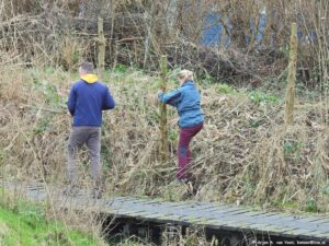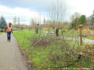 Met een grote groep waren ze met een pittige klus bezig. Proberen om alle wilgen tussen het Dunloppad en het begin van de beek te knotten. Op een paar na is het toch gelukt. Veel zagen, knippen boven je hoofd, sjouwen met de takken. Ik geloof dat er wel 40 wilgen staan. En dat met z’n twaalven.