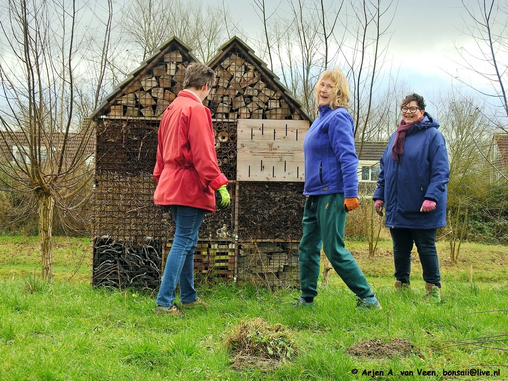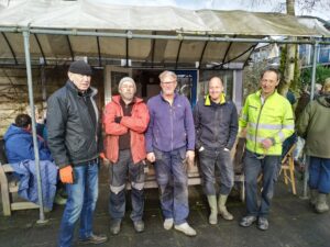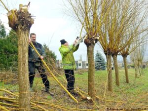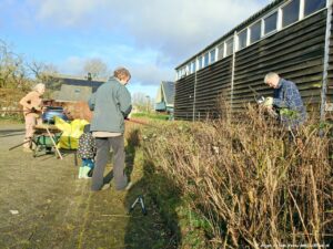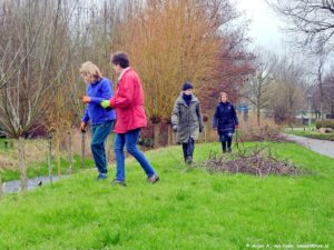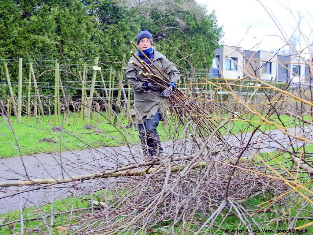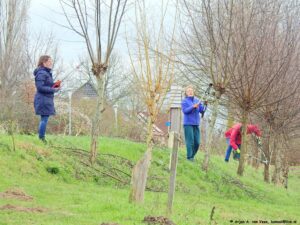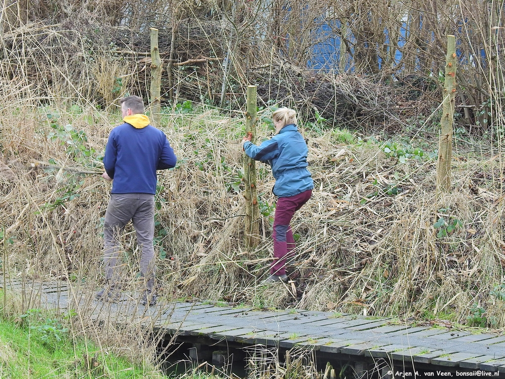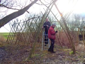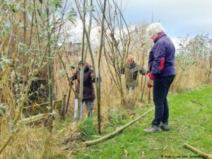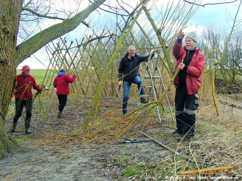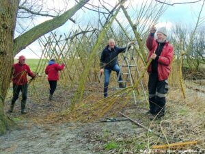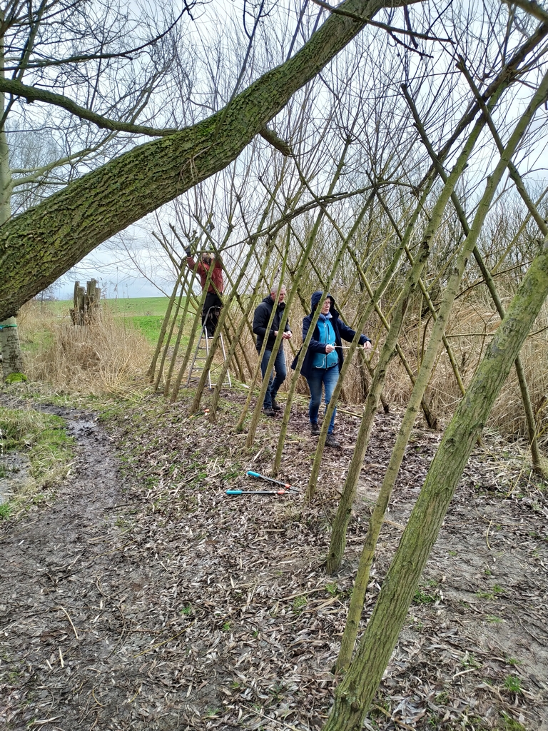 Ze zijn wel even bezig met z’n vijven van het snoeien en aanbrengen, vastknopen van nieuwe wilgentenen aan de wilgenpoort op het dijkje aan “De Plek”