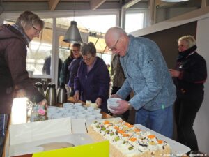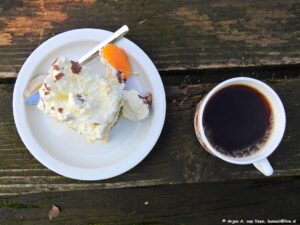 Waarom wordt het zo druk? Natuurlijk, kijk maar op tafel. Een heerlijk slagroom gebakje voor bij de koffie, dat smaakt en geregeld door Rob en Camelia.