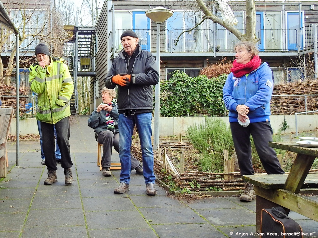 Alvorens aan het werk te gaan wilde Anneke eerst, ook namens Ine de foto plaat met de onafscheidelijke Paul en Ton laten zien wat als het bankje klaar is, daarbij geplaatst wordt.