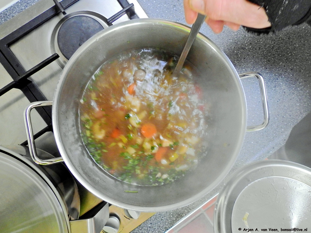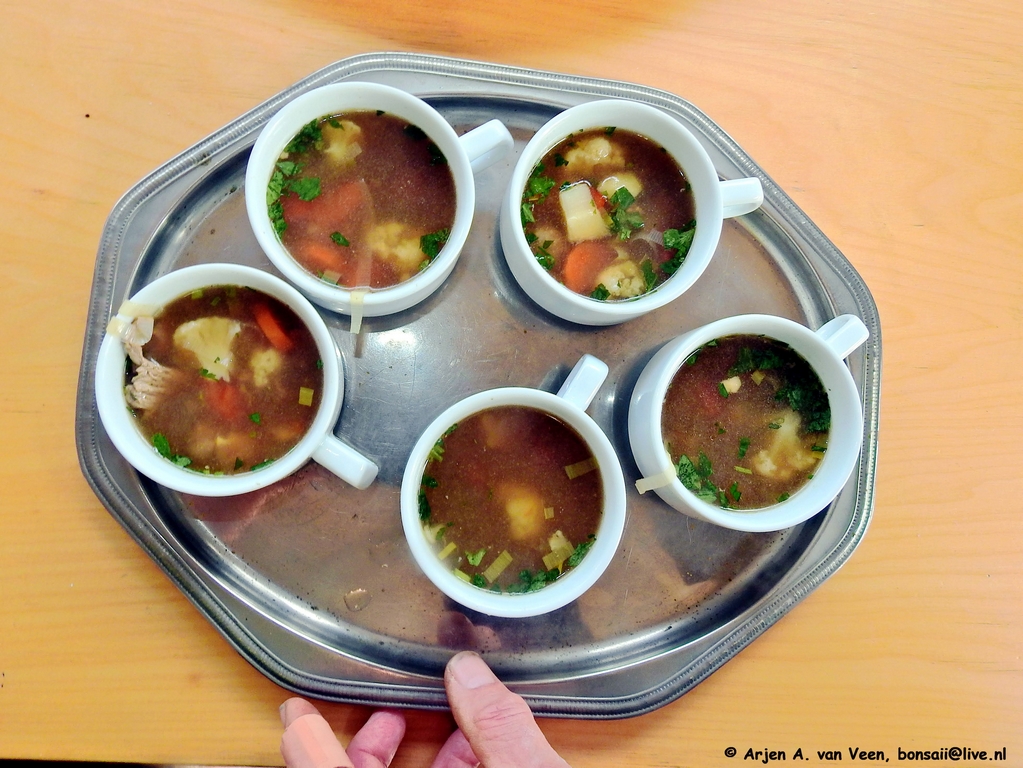 De voorbereiding voor de soepen ronde is in volle gang. Een runder-groenten soep gemaakt en geserveerd met stokbrood door Mike.